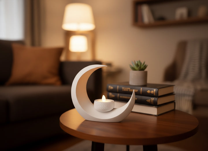 Elevate your living space with our exquisite Crescent Moon Tealight Holder, a perfect blend of modern design and warm ambiance. Crafted with meticulous attention to detail, this unique candle lamp features a graceful crescent moon silhouette, available in premium ceramic finishes (sleek black, sophisticated silver) and a rich, warm wood option. Each holder is designed to cradle an LED tealight candle, casting a soft, flickering glow that creates a serene and inviting atmosphere without the worry of open flames.
